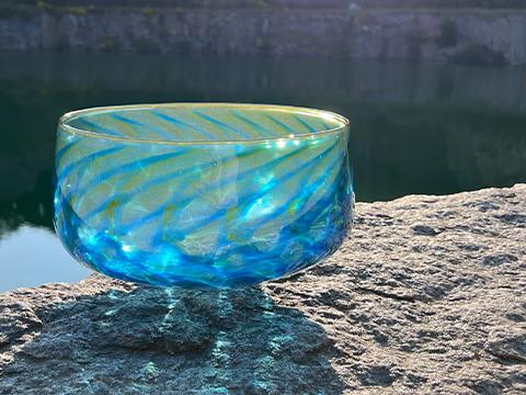 Vi har også glæde af den meget smukke glaskunst fra Baltic Sea Glass. På billedet ses vores mundblæste Unika Skål (værk NO.4721111), som er skabt af kunstnerne Maibritt Jönsson & Tobias Sode. Værket, der er fra 2021, er blevet til med inspiration fra kunstnernes oplevelser med nordlys, hvilket tydeligt ses, når solens stråler rammer glasset. Du kan læse mere om glaskunsten fra Baltic Sea Glass her.